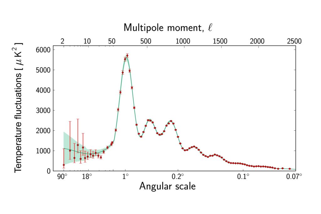 Pero aunque este patrón parezca aleatorio al ojo humano, no lo es. Puede hacerse un análisis matemático de él para extraer más información. Si por ejemplo intentamos relacionar el tamaño de las capas creadas por aquellas acumulaciones de materia oscura con la cantidad de ellas, obtenemos una gráfica como la que se muestra más abajo. En ella aparecen varios picos, que nos dan información valiosísima sobre nuestro universo. El primero de ellos, el más grande, nos habla de la curvatura del universo y nos dice concretamente que el universo es plano. El segundo y tercer pico nos hablan sobre la densidad de la materia ordinaria y de la materia oscura en nuestro universo. Es de aquí de donde extraemos que en el universo existe unas 5 veces mayor cantidad de materia oscura que de materia ordinaria.