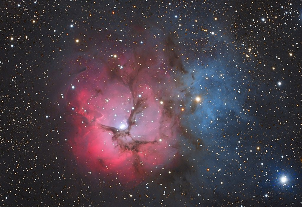No muy lejos de la nebulosa de la Laguna, en la constelación de Sagitario, se encuentra la nebulosa Trífida o Messier 20 (M20). Está situada a unos 5.200 años luz de distancia de la Tierra y es un objeto celeste único, ya que comprende una nebulosa de emisión (roja), una nebulosa de reflexión (azul) y una nebulosa oscura, pudiendo ver claramente tres glóbulos diferenciados. Catalogada por el astrónomo francés Charles Messier, esta nebulosa es un rincón de formación estelar activa, con un cúmulo estelar en su corazón. Las franjas oscuras que dan a la nebulosa su apariencia trifurcada están hechas de polvo interestelar que bloquea la luz del gas brillante que hay por detrás. También puedes observarla decentemente con binoculares desde un lugar que reúna las condiciones adecuadas.