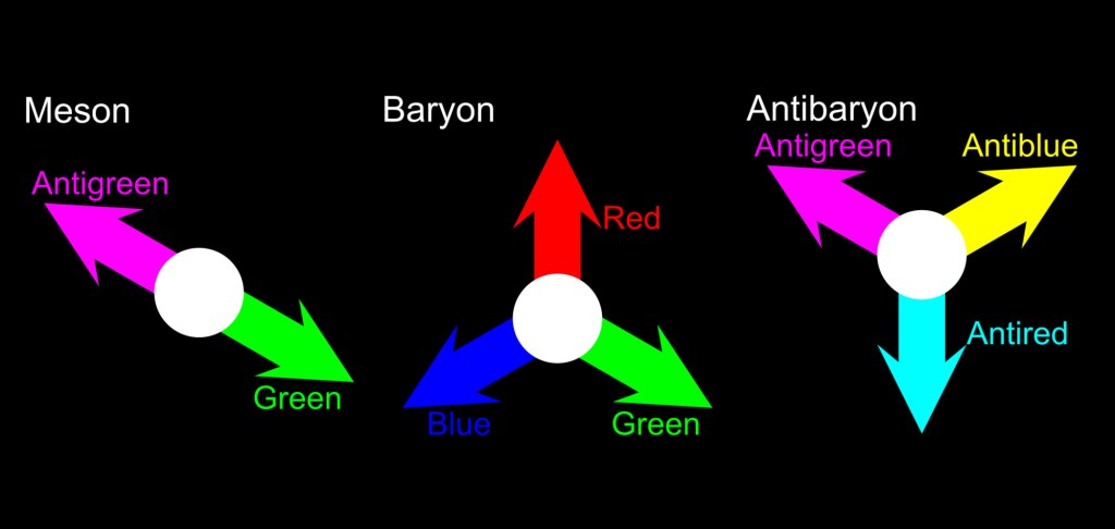 Con todo, quarks y gluones siempre tenderán a agruparse en partículas sin carga de color, partículas “blancas”. Los gluones formarán glueballs y los quarks podrán formar bariones, que son combinaciones de tres quarks como protones y neutrones, o mesones, que son combinaciones de quark y antiquark. Cuando se combinen de tres en tres, cada quark tendrá un valor para la carga de color diferente, que se sumarán y darán ese color “blanco”. En el caso de los mesones, el antiquark tendrá el anticolor del quark. Por tanto podremos tener una pareja quark-antiquark con colores azul-antiazul, por ejemplo.