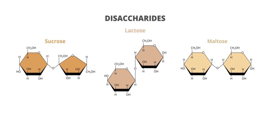 El principal componente del azúcar blanco es la sacarosa, un disacárido. Como su nombre indica, di (dos) -sacárido (azúcar), es un tipo de carbohidrato compuesto por dos moléculas de monosacáridos que están unidas por un enlace glucosídico. Los monosacáridos son las unidades, bloques de construcción, más simples de los carbohidratos y son las unidades más pequeñas en las que un hidrato complejo puede descomponerse (mediante hidrólisis). En concreto, las dos unidades (monosacáridos) que conforman el disacárido conocido como sacarosa son una fructosa y una glucosa unidos por el mencionado enlace glucosídico.