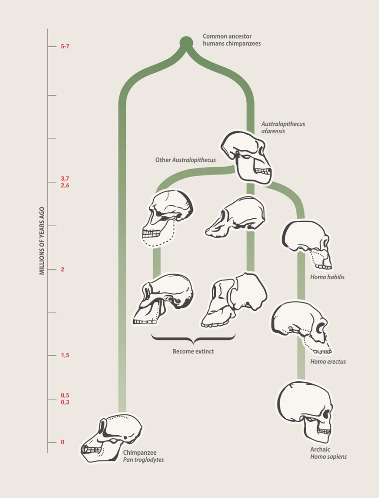 Las especies que continuaron con esta opción evolutiva forman el grupo de los homininos, al cual pertenecen también Homo sapiens y todos nuestros ancestros del género Homo. Entre los homininos ancestrales hay especies, como Sahelanthropus tchadensis y Ardipithecus ramidus, que tenían un volumen cerebral de unos 350 cm3 y un CE de 2,5.