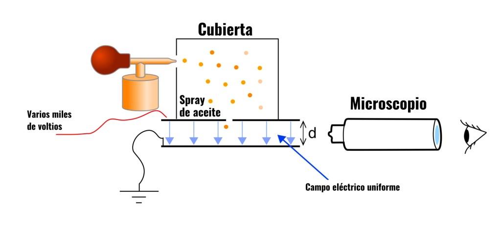 El experimento de Millikan consistía en un pulverizador de aceite, que creaba pequeñas gotitas, que se dejaban caer en el interior de un dispositivo en el que se podían controlar campos eléctricos y magnéticos para hacer flotar las gotitas que tuvieran carga eléctrica. Primero se dejaban caer las gotitas sin presencia de ningún campo electromagnético, calculando la velocidad alcanzada y sus propiedades generales. Al aplicar unos campos eléctrico y magnético concretos, solo quedarían suspendidas las gotitas de un cierto tamaño, con una cierta cantidad de carga. Tras medir una gran cantidad de estas gotitas Millikan, junto a su estudiante Harvey Fletcher, observaron que la carga de las gotitas siempre era un múltiplo de un valor más pequeño, que dedujeron debía ser el valor de la carga de la partícula que la contenía, del electrón.