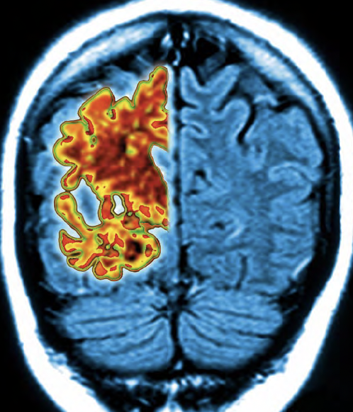 Resonancia magnética de un encéfalo que se ha encogido por la muerte de neuronas que causan los depósitos de proteína ß-amiloide. - AGE