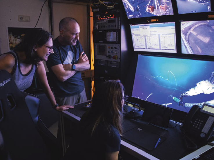 La bióloga Nerida Wilson –a la izquierda– contempla a través de las cámaras del robot SuBastian una apolemia bioluminiscente de 46 m de largo. - INSTITUTO OCEÁNICO SCHMIDT