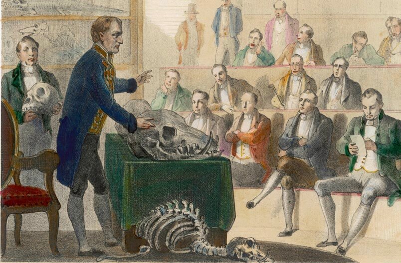 Pero quien más veces ha sido señalado como padre de la paleontología fue su compatriota Georges Cuvier (1769-1832), quien estudió con detalle los fósiles de elefantes encontrados en Francia y los comparó con otros proboscidios de África, la India y Siberia. Concluyó que todos los actuales eran diferentes a los de los restos fosilizados y empezó a masticar la teoría del catastrofismo. Cuvier fue el primer científico que propuso que la extinción de los dinosaurios se debió a una catástrofe natural.