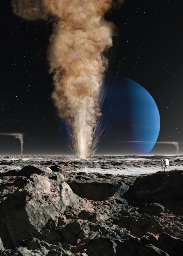En otras regiones todavía más frías del Sistema Solar también se han encontrado señales de actividad geológica. En 1989, la Voyager 2 visitó Neptuno y sus lunas. Hasta el momento, es la única vez que ha sucedido tal cosa. A la distancia a la que se encuentra ese mundo, el astro rey es poco más que un punto de luz, por lo que cabría esperar que todo estaría congelado, en estado sólido. De hecho, la temperatura en la superficie de Tritón, el mayor de sus satélites, se encuentra a unos 235 ºC bajo cero.