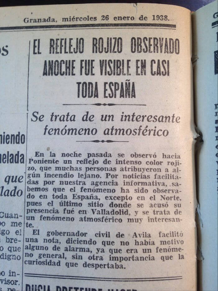 La noche del 25 al 26 de enero de 1938 los cielos en España se encendieron, y no fue por los fuegos de artillería que se cruzaban por causa de la Guerra Civil. Grandes extensiones de nubes se cubrieron de tonos naranjas y rojos, como si en la lejanía se estuviese produciendo un fuego de dimensiones bélicas. Entre los integrantes de ambos bandos cundió el pánico. James Neugass, un brigadista americano, llegó a escribir en su libro La guerra es bella: “El cielo se iluminó con una cortina de fuego roja y malva”.