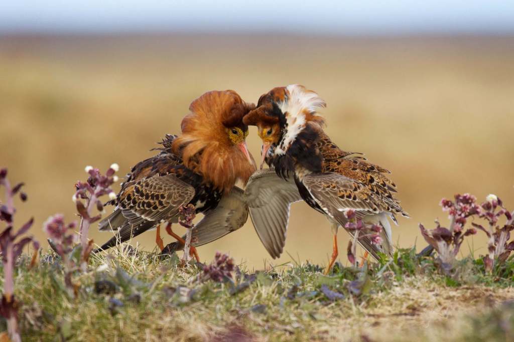 Hemos hablado de varios sistemas en los que hay distintos tipos de machos, pero la cosa se complica aún más en el caso de los combatientes (Philomachus pugnax). Se trata de aves muy fácilmente reconocibles por sus vistosos plumajes y sus espectáculos en época de reproducción. Los machos lucen grandes gorgueras de plumas y moños auriculares, cuyos colores y diseños varían individualmente. En un área especial de terreno, estos machos se exhiben y compiten entre sí, no solo para atraer a las hembras, sino también para establecer jerarquías.