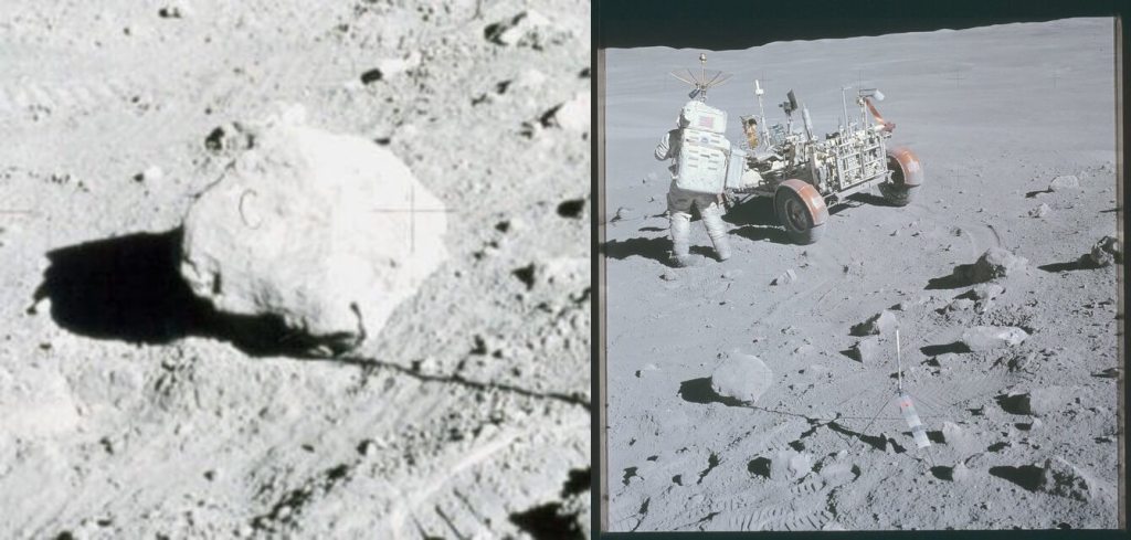 Respuesta 24: Los fondos parecen el mismo debido a que en la Luna es prácticamente imposible calcular las distancias debido a la falta de atmósfera, pues perdemos sensibilidad a la distancia. Basta con mirarlas y compararlas: