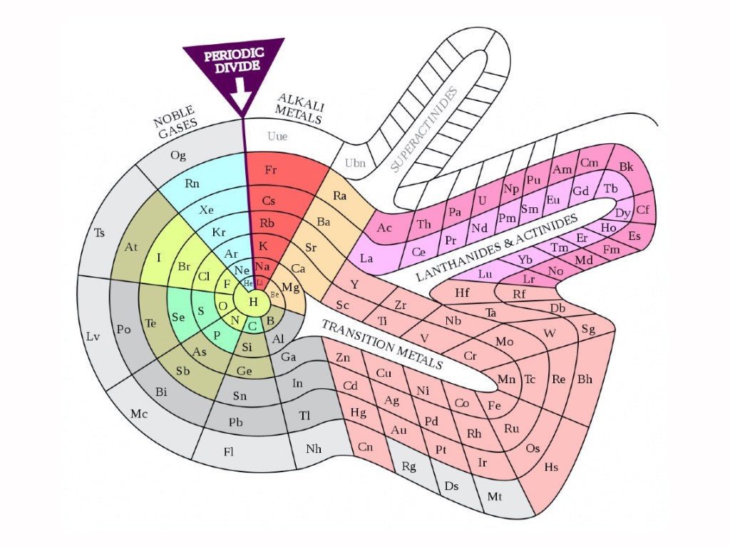 Además, esta nueva disposición evita la necesidad de utilizar líneas discontinuas o flechas para conectar elementos que comparten propiedades similares, como se hacía en algunas representaciones anteriores. En lugar de eso, la espiral cuadrada agrupa los bloques "s" y "p" en la parte inferior, mientras que los bloques "d" y "f" se organizan en sus propias secciones, lo que facilita la identificación de las relaciones entre los elementos. Este diseño no solo mejora la claridad visual, sino que también resalta la dualidad del hidrógeno, colocándolo en una posición que refleja mejor su comportamiento químico tanto como metal alcalino como halógeno.