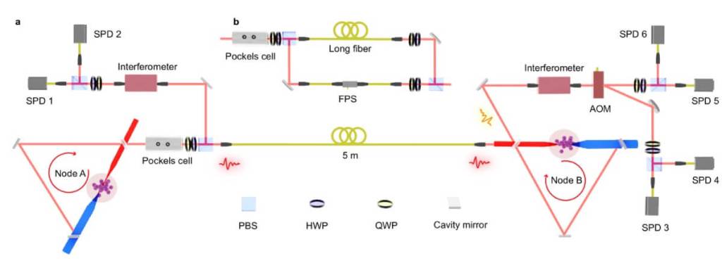 El montaje experimental incluye dos nodos cuánticos, llamados A y B, compuestos por nubes de átomos de rubidio. El nodo A genera un fotón en un estado cuántico codificado temporalmente (es decir, en función del momento exacto en que aparece), y lo envía al nodo B a través de una fibra óptica.