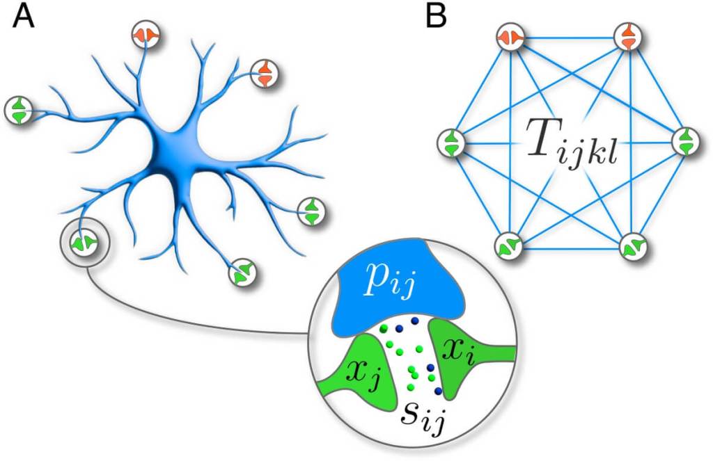 Lo fascinante del nuevo modelo es que introduce interacciones de cuatro elementos a través de una red de procesos astrogliales, permitiendo una codificación mucho más compleja y eficiente. La presencia del tensor T, una estructura matemática que representa estas conexiones, es clave para entender cómo los astrocitos podrían facilitar interacciones entre sinapsis lejanas y contribuir así a redes de memoria más potentes.