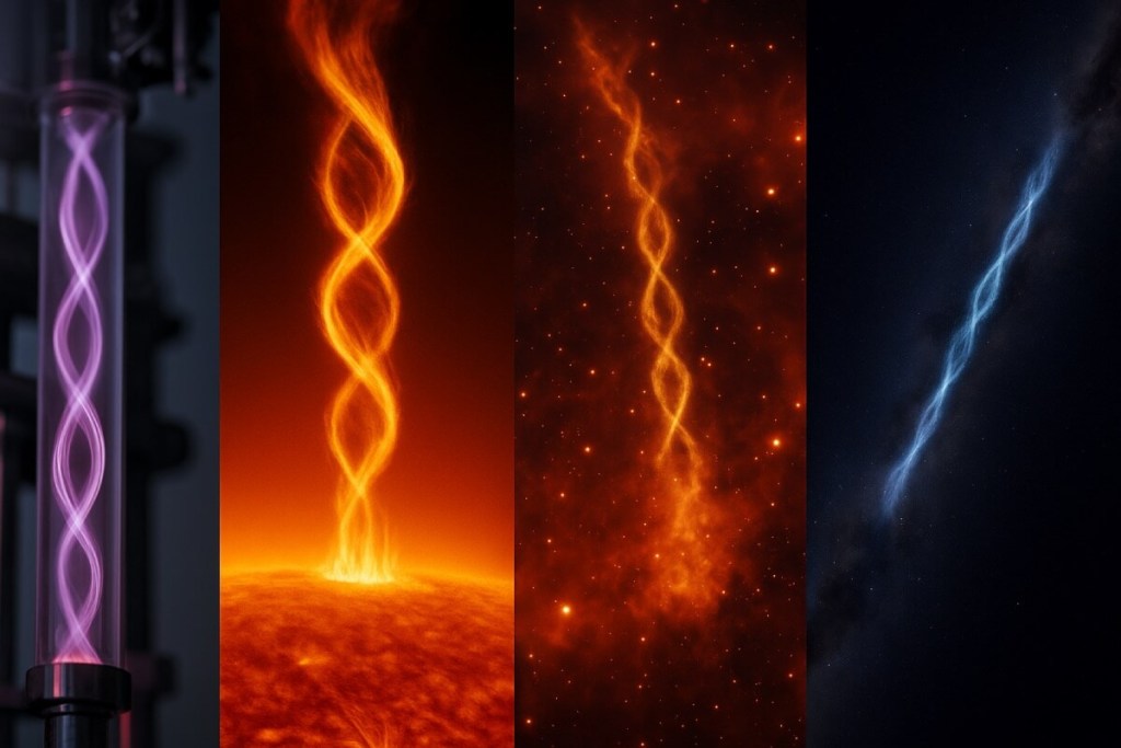 En el centro de la Vía Láctea, a unos 25.000 años luz de la Tierra, se encuentra una estructura sorprendente que parece sacada de un laboratorio de biología molecular: dos filamentos luminosos entrelazados, formando una espiral doble que recuerda al ADN. No es una coincidencia estética. Esa forma tan familiar esconde un fenómeno físico profundo, relacionado no con la vida, sino con el comportamiento del plasma, el cuarto estado de la materia, que constituye la mayor parte del universo visible. Lo más fascinante es que los investigadores han logrado replicar esta estructura a escala de laboratorio, revelando que las mismas leyes que rigen en una cámara de vacío de medio metro también explican lo que ocurre a escalas de años luz.
