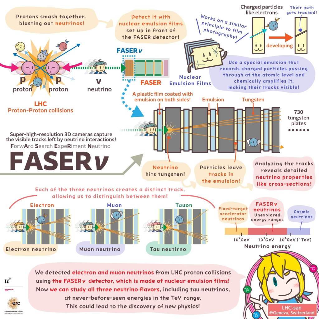 Ubicado a 480 metros de distancia de uno de los puntos de colisión del LHC, FASER se encuentra en la trayectoria en la que se espera que viajen los neutrinos producidos en los choques entre protones. Hasta ahora, la mayoría de los neutrinos detectados provienen de fuentes astrofísicas o reactores nucleares, pero con FASER se ha logrado por primera vez la detección directa de neutrinos en un colisionador de partículas.