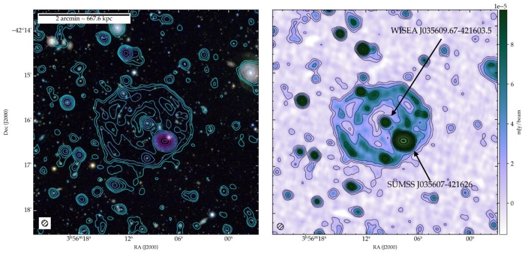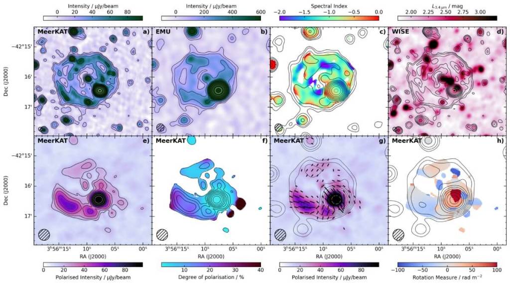 Un equipo internacional liderado por Sam Taziaux, de la Universidad de Ruhr en Bochum, ha sido aceptado para ser publicado en Astronomy & Astrophysics el estudio más detallado hasta la fecha de uno de estos objetos: ORC J0356–4216, descubierto en 2023 con el radiotelescopio MeerKAT en Sudáfrica y posteriormente observado con ASKAP en Australia. Según escriben los autores, “presentamos el primer estudio de polarimetría de radio continuo de un nuevo sistema tipo ORC, al que llamamos ORC J0356–4216”. Este análisis revela un doble anillo de más de 660.000 años luz de diámetro y ofrece pistas sobre su posible origen.