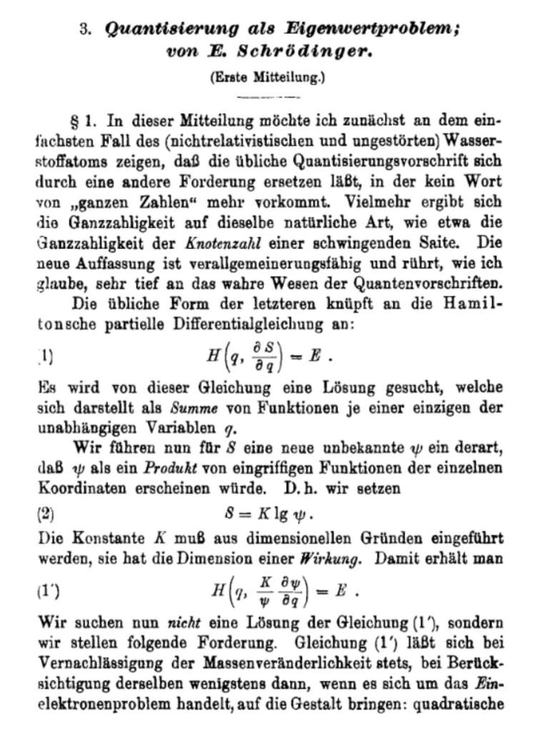 En 1926, Erwin Schrödinger presentó una de las formulaciones más influyentes de la mecánica cuántica en su artículo “Quantisierung als Eigenwertproblem” (“Cuantización como problema de valores propios”), publicado en Annalen der Physik. En este trabajo, introdujo lo que hoy conocemos como la ecuación de Schrödinger, una herramienta matemática que permite describir la evolución en el tiempo del estado cuántico de una partícula mediante una función de onda.