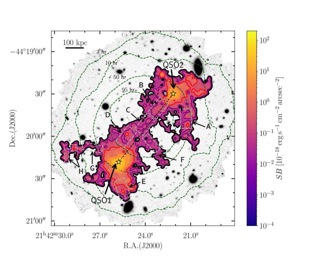 El equipo de investigadores llevó a cabo una de las campañas de observación más largas con el instrumento MUSE, acumulando 142 horas de exposición. Gracias a esta estrategia, lograron captar la luz emitida por un filamento de gas que se extiende a lo largo de 700.000 años luz, conectando los dos quásares.