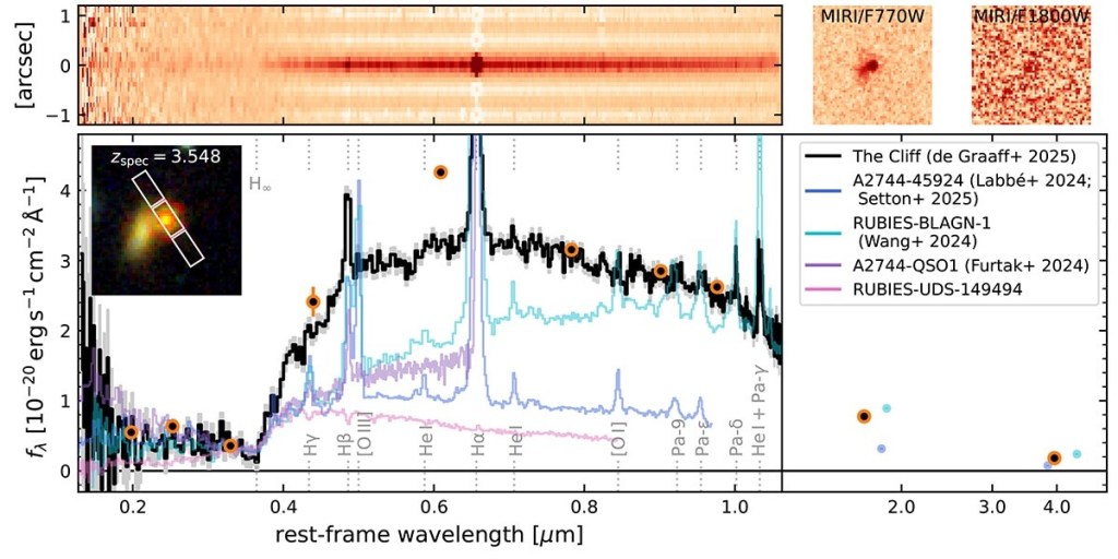 Un reciente trabajo liderado por Anna de Graaff y publicado en Astronomy & Astrophysics propone que uno de estos objetos, apodado “El Acantilado” (The Cliff en inglés), representa algo completamente nuevo: una estrella de agujero negro. Según los autores, este hallazgo constituye la evidencia más clara hasta ahora de que al menos parte de los puntos rojos no son galaxias extremadamente densas, sino fuentes alimentadas por agujeros negros rodeados de gas denso que brilla al ser calentado.