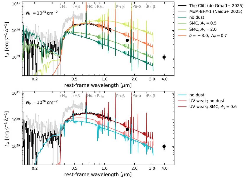 Lo que diferencia a estas supuestas estrellas de agujero negro de los núcleos activos de galaxias (AGN) conocidos es que su gas envolvente es mucho más denso y su espectro más rojo. El modelo implica tasas de acreción super-Eddington, es decir, crecimientos del agujero negro más rápidos de lo que predicen los límites clásicos de la astrofísica.
