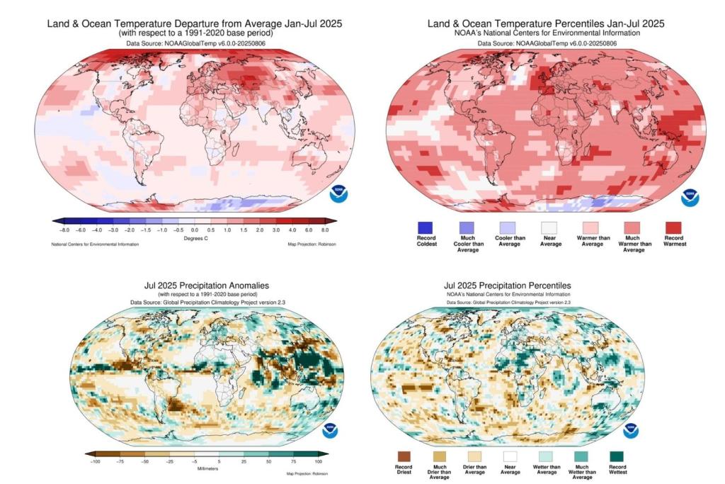 Uno de los datos más reveladores del informe de la NOAA es que la temperatura media global de la superficie terrestre y oceánica para lo que va de 2025 (de enero a julio) supera en 1,18 °C el promedio del siglo XX. Esto convierte a 2025, hasta ahora, en el año más cálido registrado, superando incluso al récord establecido en 2023.