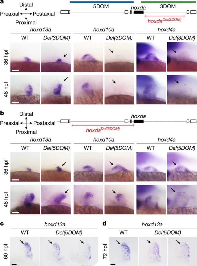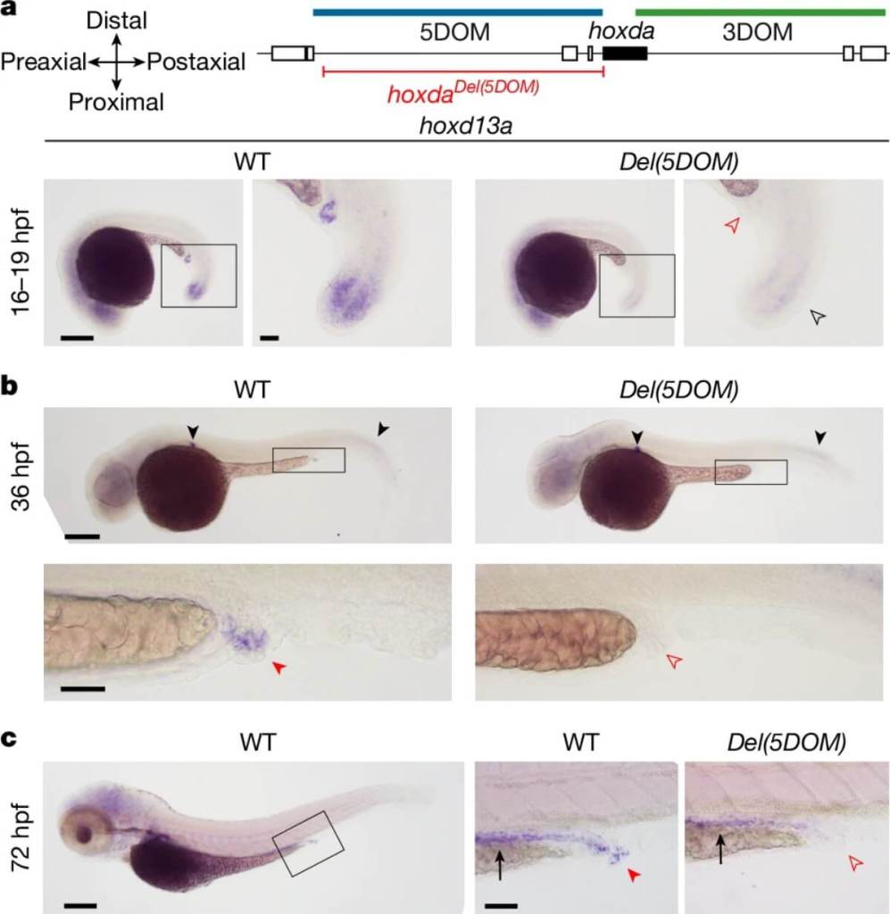 Esto demostró que, en los peces, el paisaje regulador 5DOM está especializado en controlar el desarrollo cloacal, no el de las aletas. En cambio, en los tetrápodos, ese mismo paisaje fue reutilizado evolutivamente para desarrollar estructuras nuevas, como los dedos. Según el artículo, “la conservación de más de 350 millones de años de la regulación de Hoxd13 en la región cloacal mediante secuencias localizadas en 5DOM sugiere un papel ancestral de Hoxd13 en la morfogénesis cloacal”.