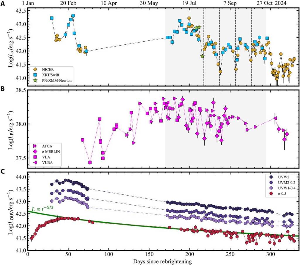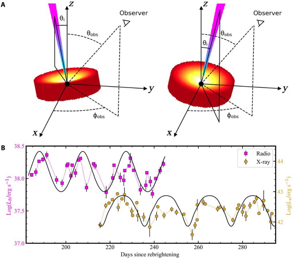 El estudio publicado en Science Advances describe de manera detallada cómo ese patrón permitió detectar, por primera vez, una precesión conjunta del disco y del chorro generados tras la destrucción de la estrella. En el propio artículo se explica que el evento presenta “variaciones cuasiperiódicas de 19,6 días en rayos X y en radio, con amplitudes en rayos X superiores a un orden de magnitud”. La presencia de variaciones tan marcadas y sincronizadas en dos señales diferentes llevó al equipo a examinar si la relatividad general estaba actuando de una forma que hasta ahora no había podido observarse de forma directa. Ese análisis abrió una vía nueva para estudiar cómo giran los agujeros negros y cómo afectan al entorno que los rodea.