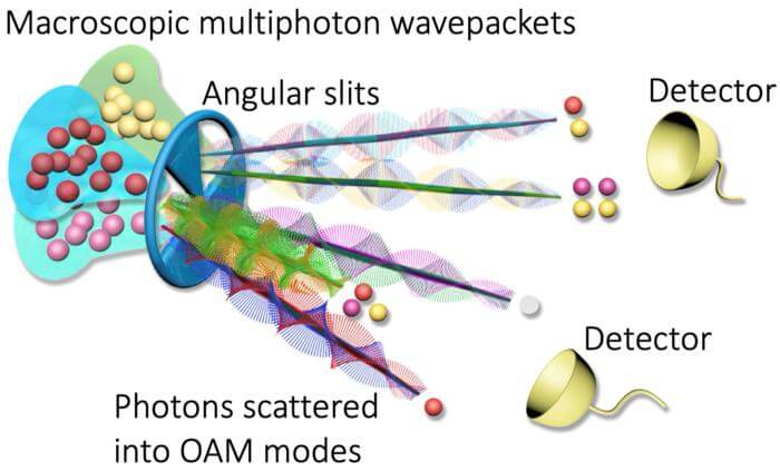 El diagrama ilustra el proceso de dispersión multipartícula mediada por trayectorias retorcidas dotadas de momento angular orbital (OAM). El número de fotones en cada trayectoria retorcida se mide y se correlaciona utilizando detectores de resolución de número de fotones (PNR). Fuente: PhotoniX
