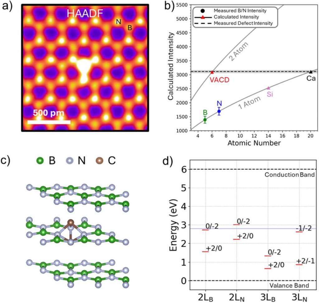 El hallazgo más llamativo es que uno de los emisores detectados emite luz azul con una longitud de onda de 440 nanómetros, y que su origen se encuentra en un dímero de carbono: dos átomos de carbono colocados uno encima del otro, incrustados en el material. Esa estructura, conocida como VACD (dímero de carbono intersticial vertical), es responsable de la emisión de luz observada.