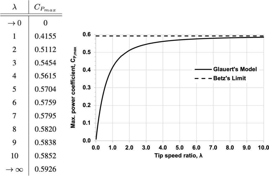 Uno de los conceptos más importantes en aerodinámica de turbinas es el coeficiente de potencia, que mide cuánta energía del viento puede ser convertida en electricidad. Glauert demostró que existe un límite teórico, conocido como límite de Betz, que impide que una turbina aproveche más del 59,26 % de la energía del viento: