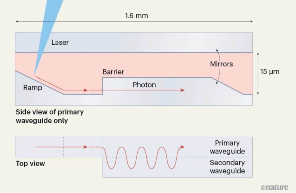 A partir de ahí, diseñaron una estructura con dos canales paralelos —llamados guías de onda— y una especie de “rampa” para generar los fotones con distintas energías. La clave estaba en una barrera larga, tan larga que, para los fotones, parecía infinita. Los fotones avanzaban por la guía principal, llegaban a la barrera y, al atravesarla, también se desplazaban lateralmente hacia la segunda guía. Este movimiento lateral era cuantificable y periódico, y permitió medir cuánto tiempo pasaban dentro de la barrera.