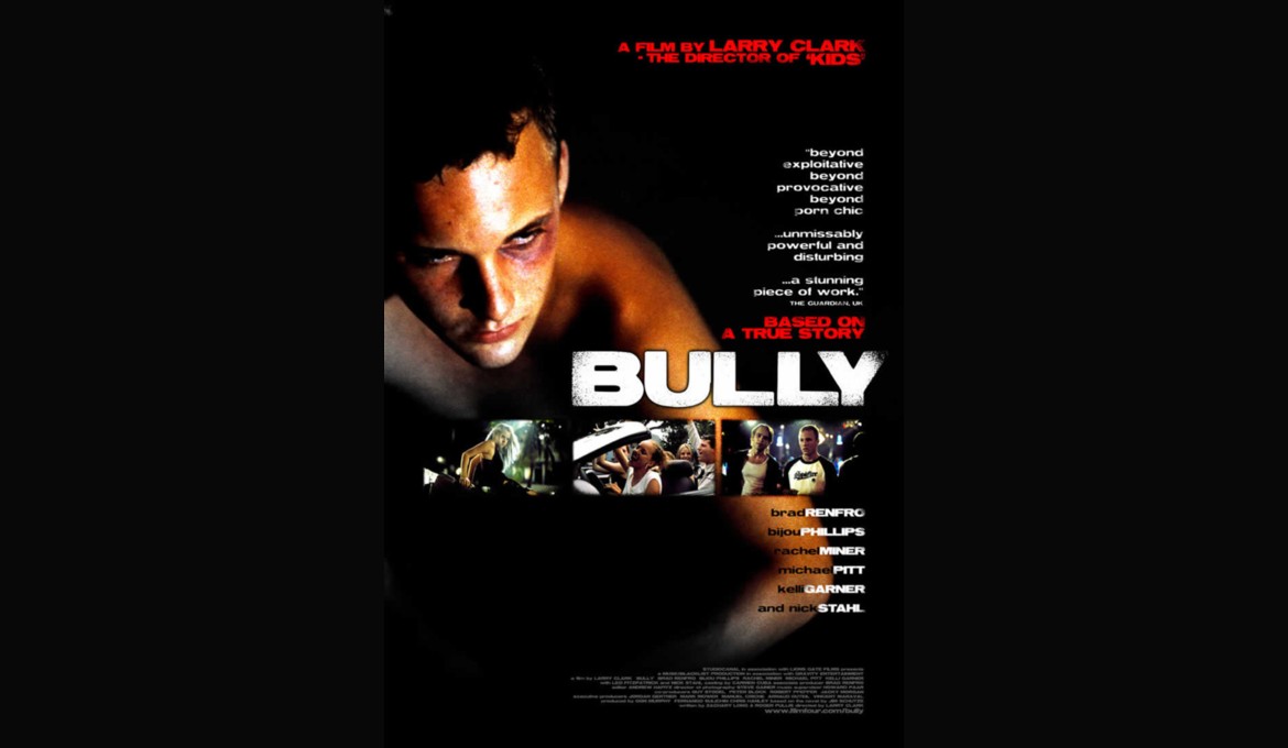 Se trata de una película independiente dirigida por Larry Clark y basada en hechos reales. Nos cuenta la historia retorcida de los estudiantes de secundaria del sur de la Florida (EE. UU.) que asesinaron a un sádico amigo que los acosaba (bullying). Bully es una cinta difícil de soportar, en la que la actuación de Brad Renfro (que murió en 2008 a los 25 años de una sobredosis) es inquietante cuanto menos.