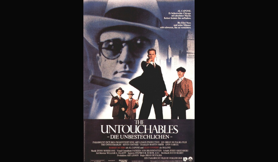 Sin duda una de las mejores películas del director Brian De Palma. En ella, Kevin Costner interpreta al agente federal Eliot Ness, que intenta atrapar a l famoso Al Capone (encarnado por Robert De Niro). La secuencia de la escalera, inspirada en la película muda Battleship Potemkin, es una mini obra maestra del cine de suspense. La película fue nominada 4 premios Óscar. Sean Connery recibió el Óscar a mejor actor de reparto.