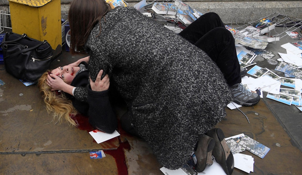 Esta fotografía atestigua las consecuencias inmediatas tras un ataque en el corazón de Londres. En ella, un transeúnte reconforta a una mujer herida después de que Khalid Masood condujera su vehículo contra peatones en el puente de Westminster en Londres, Reino Unido, matando a cinco personas e hiriendo a muchas otras.