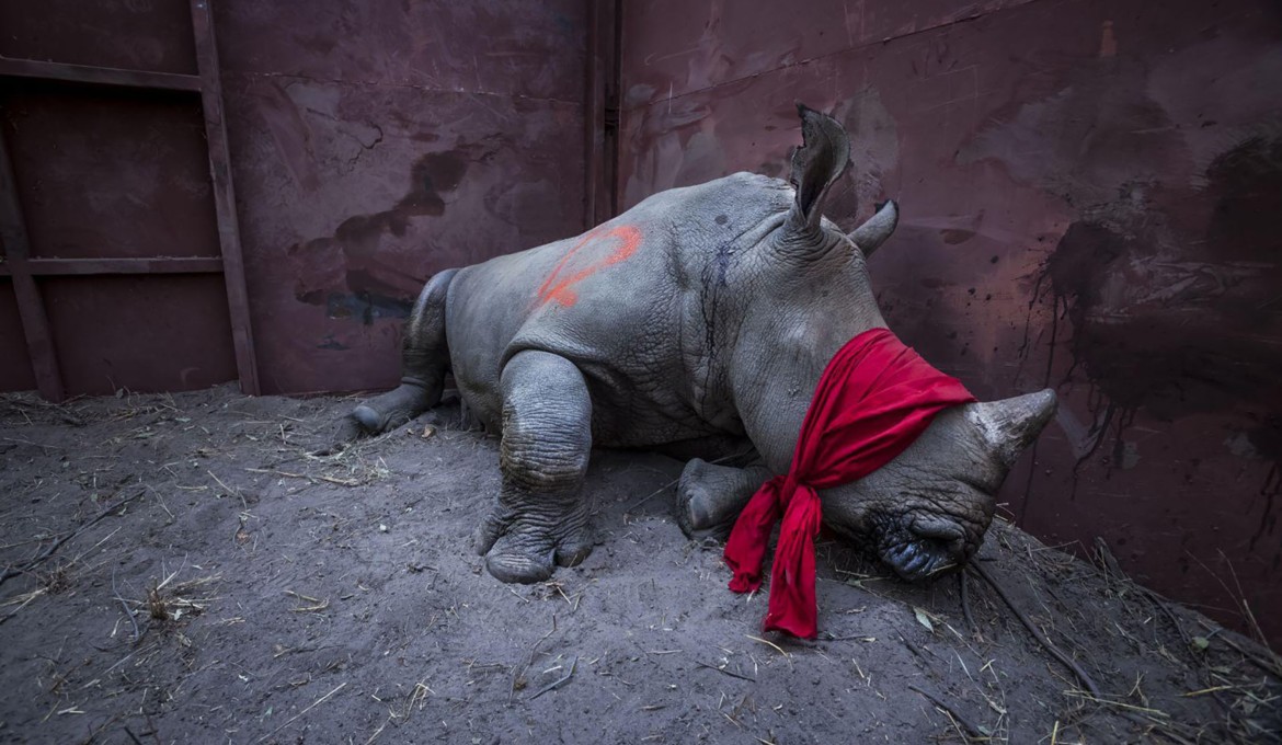 En esta imagen, un joven rinoceronte blanco, drogado y con los ojos vendados con un pañuelo de color rojo sangre, espera ser liberado en el Delta del Okavango, Botswana, después de su reubicación desde Sudáfrica para protegerlo de los cazadores furtivos.
