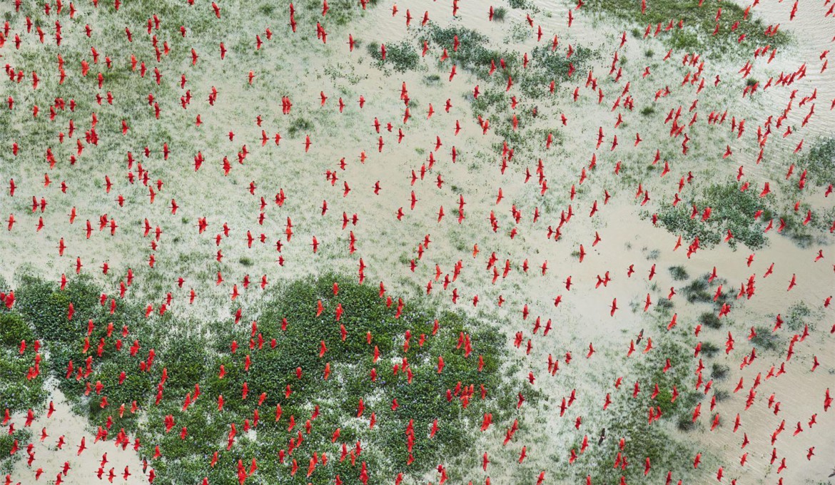 Una fotografía que muestra el avance de la deforestación en el Amazonas, Brasil. Después de disminuir desde los picos principales en 1995 y 2004, la tasa de deforestación en el Amazonas ha aumentado bruscamente en 2016. El corocoro rojo o ibis escarlata (Eudocimus ruber) al igual que otras especies que habitan el Amazonas ha visto disminuida su población, lo que puede conducirlos a la desaparición o perturbación de su hábitat.