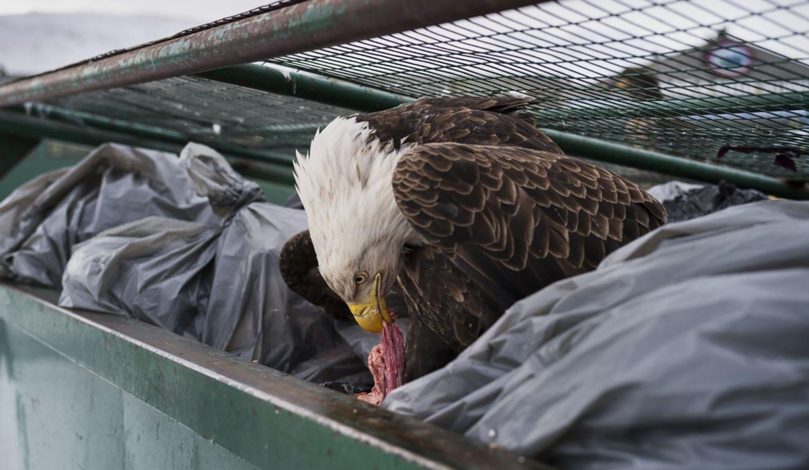 Un águila calva disfruta de unos restos de carne en los contenedores de basura de un supermercado en Dutch Harbor, Alaska, Estados Unidos. La población de águila calva es mucho mayor que lo que entorno puede sostener, de ahí que tengan que buscar comida donde sea.