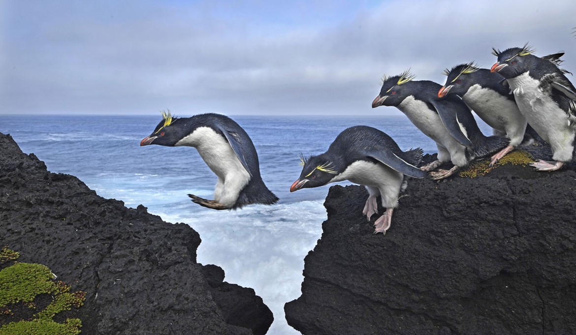 Los pingüinos de penacho amarillo (Eudyptes chrysocome) o saltarrocas hacen honor a su nombre mientras navegan por la escarpada costa de Marion Island, un territorio antártico sudafricano en el Océano Índico.