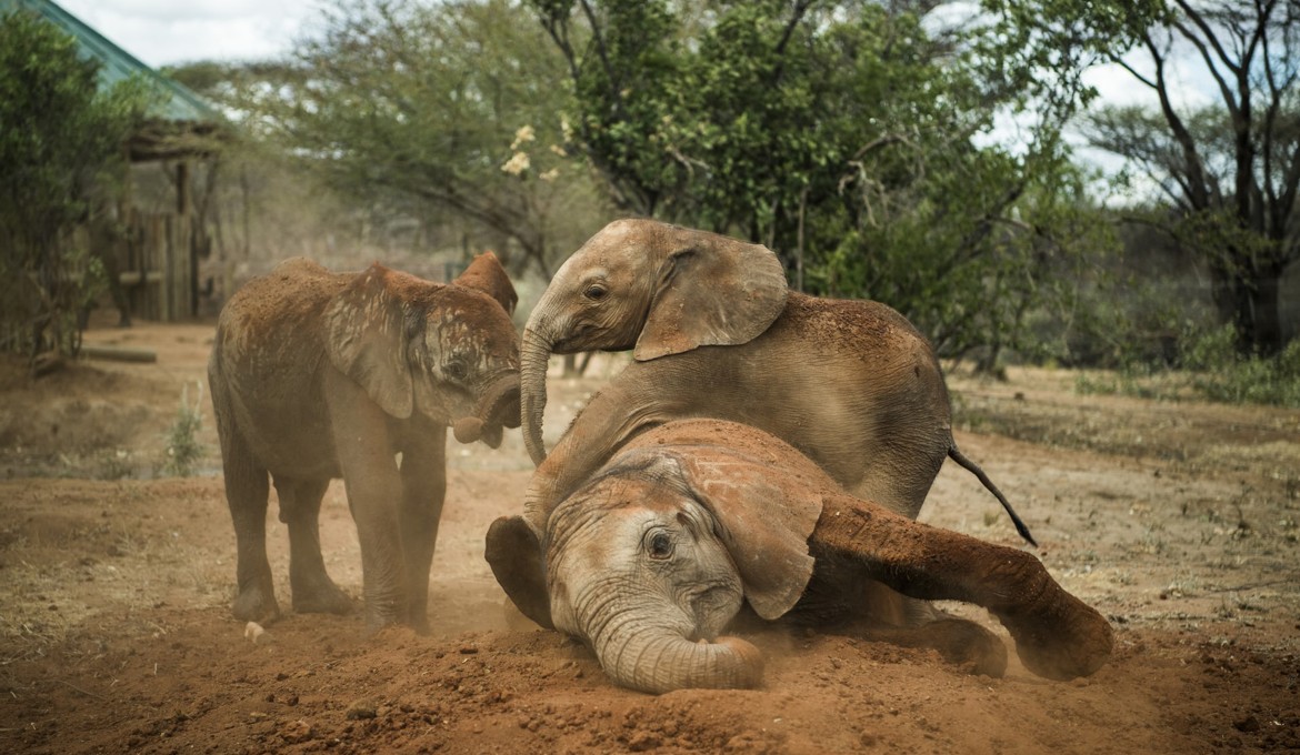 Unos terneros huérfanos juegan en el santuario de elefantes Reteti propiedad de la comunidad en el norte de Kenia, en África oriental.