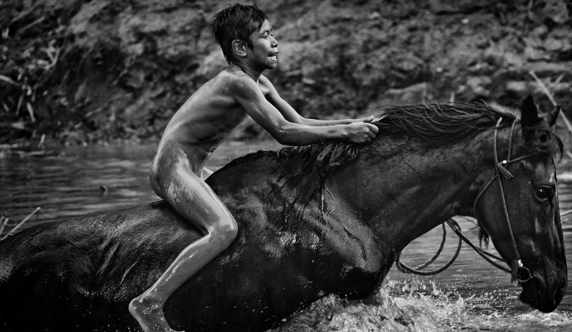 Después de un día de carreras, los niños montan a caballo para refrescarse. Todos los niños del vecindario aprovechan ese momento para jugar con los caballos en el río. Aquí un jinete joven se une de forma juguetona con su caballo fuera de la atmósfera seria de la pista de carreras. Los niños jockeys montan a pelo, descalzos y con poco equipo de protección, en caballos pequeños, durante las carreras de caballos tradicionales de Maen Jaran, en la isla de Sumbawa, Indonesia.