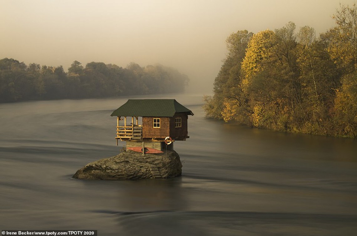 La fotógrafa húngara Irene Becker recibió muchos elogios por esta imagen de la casa de vacaciones 'The River House' en el río Drina cerca de Bajina Basta en Serbia.