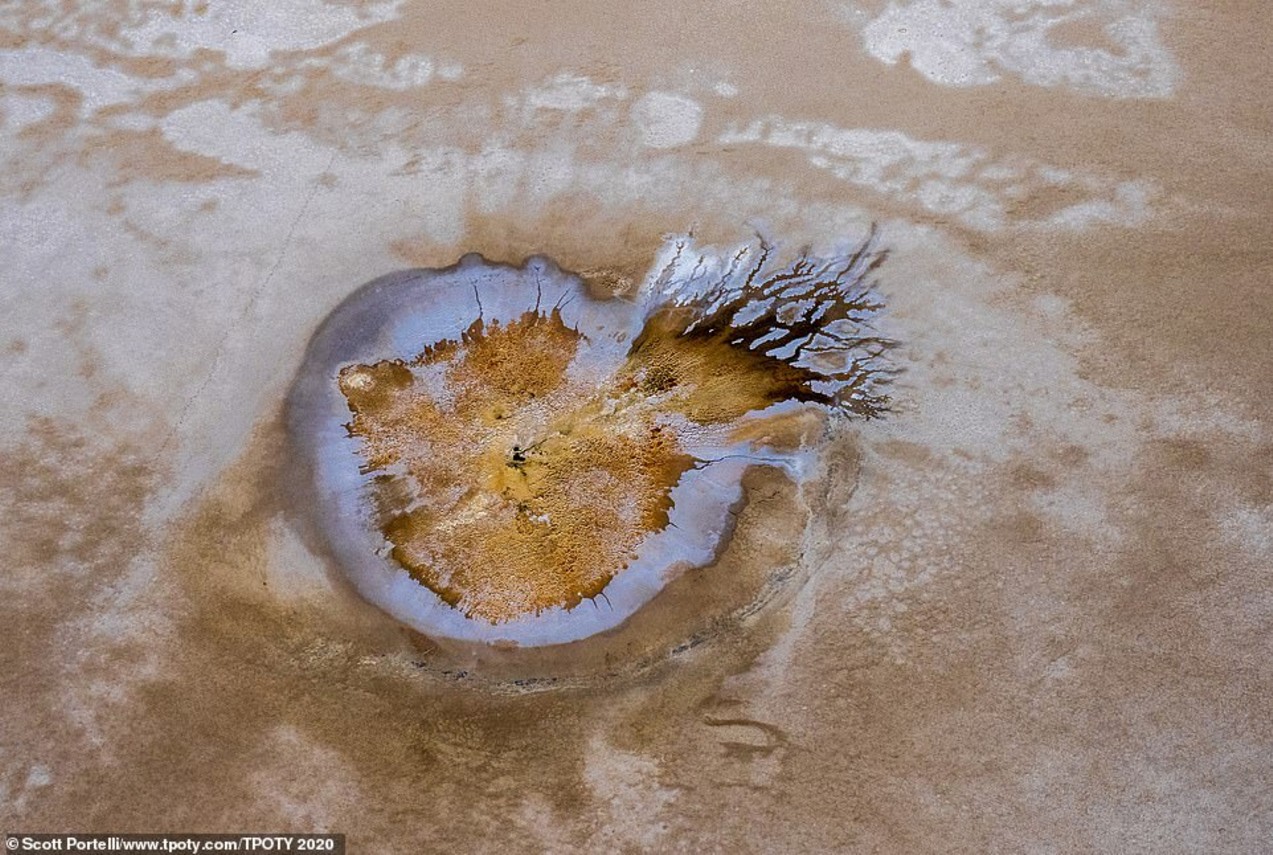 El lago Eyre es el lago salado más grande de Australia y con esta imagen hipnótica del australiano Scott Portelli ganó el segundo lugar en la categoría de "portafolio de paisajes y elementos de la tierra". El lago solo se cubre de agua cada ocho años en promedio. La vasta llanura de sal domina el paisaje con patrones que deja el agua tras retroceder.