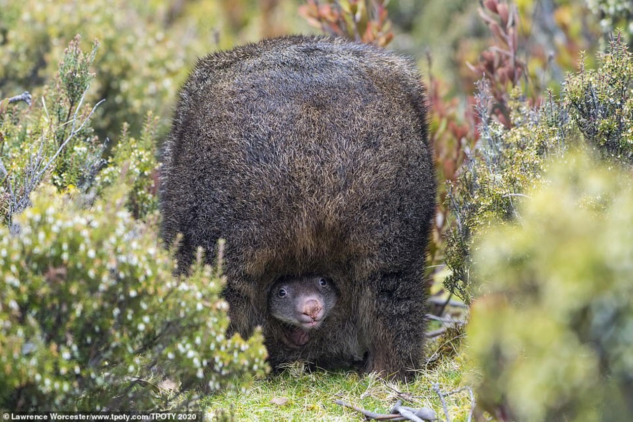 El estadounidense Lawrence Worcester recibió una mención especial por esta imagen cómica de un wombat en el Parque Nacional Cradle Mountain, Tasmania. Él dijo: 'Habiendo descubierto que los wombats son generalmente esquivos en mis viajes por Australia, y en Tasmania en particular, estaba emocionado de encontrarlos como presas fotográficas más fáciles en el Parque Nacional Cradle Mountain. Además, apenas puedo describir lo emocionado que estaba al encontrar varios con "joeys". Fue una gran sorpresa la primera vez ver a la madre mordisqueando hierba en el frente mientras el joey probaba algunos bocados en la parte de atrás