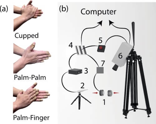Los investigadores analizaron tres tipos de aplausos: manos cóncavas, planas y con los dedos golpeando la palma, utilizando cámaras de alta velocidad y sensores de presión. Fuente: Physical Review Research