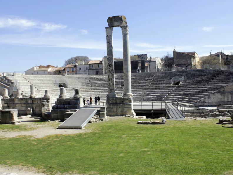 Construido a finales del siglo I a.C., poco después de la fundación de la colonia romana en esta localidad de la antigua provincia francesa de Provenza.El diseño original del teatro incluía tres partes: la cavea, espacio semicircular que recibe a los espectadores, la escena donde actuaban los protagonistas y el muro que servía a la vez de decorado y cierre del monumento.Esta edificación romana, conocida como “teatro antiguo”, tiene la particularidad de ser uno de los primeros teatros de piedra del mundo romano.