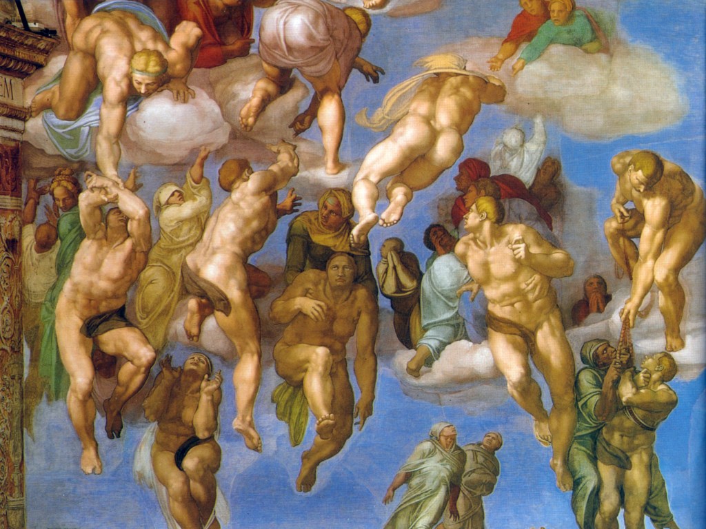 "El Juicio Final" de Miguel Ángel es una representación poderosa y conmovedora del destino de las almas después del juicio divino. En la obra, las almas de los salvados ascienden hacia el cielo, rodeando a Cristo en una composición aérea que simboliza la redención y la salvación. Estas figuras, llenas de luz y serenidad, contrastan con las almas de los condenados, que descienden hacia las tinieblas en el lado opuesto de la pintura. Este contraste entre la luz y la oscuridad es un testimonio de la habilidad de Miguel Ángel para crear narrativas visuales complejas y emocionalmente resonantes.