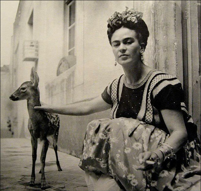 La pintora mexicana Frida Kahlo cuidó a lo largo de su vida de numerosos animales. Así lo demuestran sus fotografías personales, donde la pintora aparece retratada en numerosas ocasiones junto a aves exóticas, perros o monos. En la imagen podemos ver a la retratista junto a su ciervo Granizo. Muchos de los animales con los que convivió Kahlo aparecen representados en su obra, y este ciervo probablemente inspirase a la artista en la pintura El venado herido, en la que se autorretrata como un ciervo herido con siete flechas.