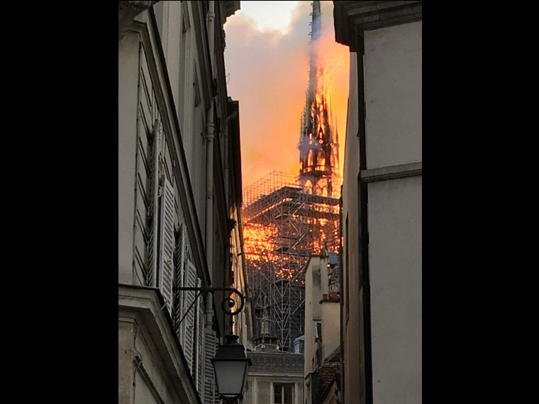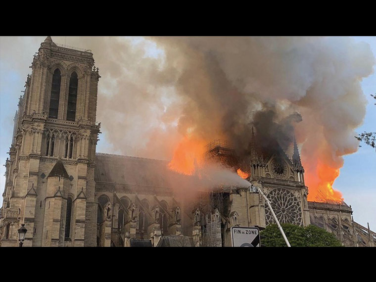 Hacia las 18 horas del lunes 15 de abril de 2019, se desencadena un incendio de considerables proporciones que afecta a la mayor parte de la estructura de la catedral de Notre Dame. Lo más probable es que las llamas fueran consecuencia de nuevos trabajos de remodelación que la catedral llevaba experimentando.