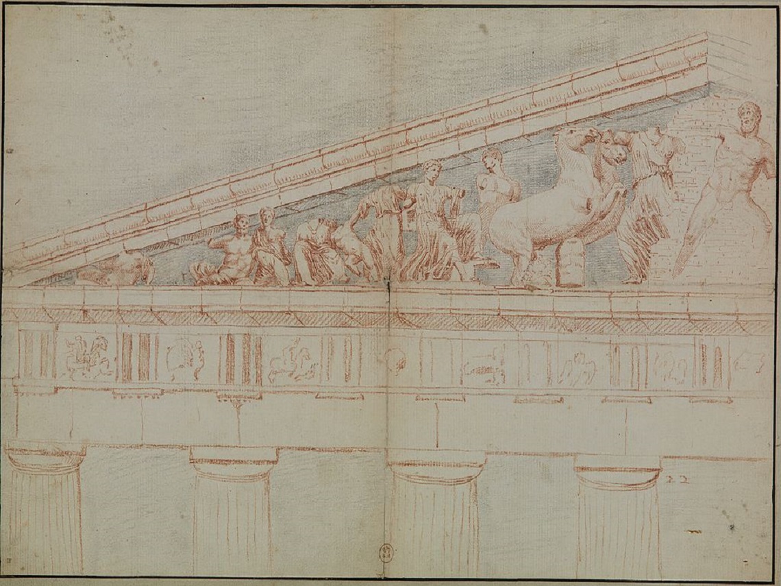 Antes del traslado de los mármoles a Gran Bretaña, la acrópolis ateniense y el Partenón constituían una de las metas de viajeros y artistas. Este dibujo del frontón se atribuye al pintor francés Jacques Carrey (1649-1726).