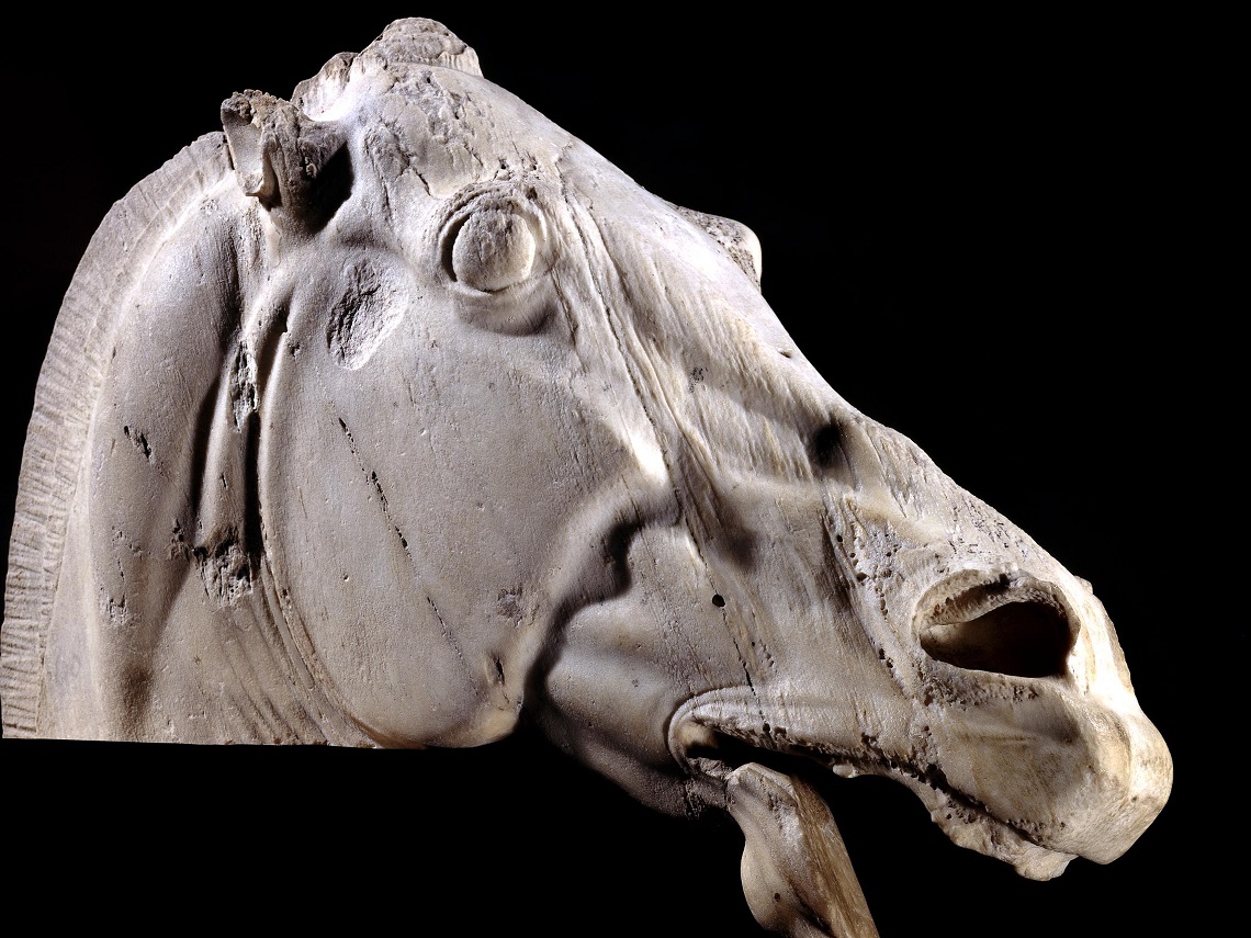 Colocada inicialmente en el frontón este del Partenón, esta cabeza equina correspondía a uno de los caballos que tiraban del carro de la diosa lunar Selene. El torso de la diosa, junto a las estatuas de otros dos caballos, se encuentran en el Museo de la Acrópolis.