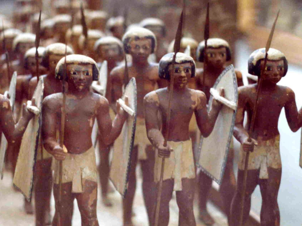 A pesar de que la civilización egipcia ya existía en el IV milenio a.C., su desarrollo militar era escaso. El desierto que la rodeaba por el este y el oeste era una excelente protección y le permitía estar a salvo de grandes invasiones, a diferencia de los pueblos mesopotámicos, abiertos a las correrías de los pueblos vecinos. Ello le llevó a descuidar el desarrollo del ejército, en comparación con las civilizaciones que entre el Tigris y el Éufrates se estaban creando simultáneamente.